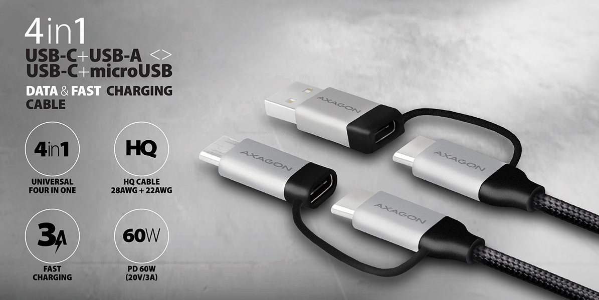 Přibalený kvalitní, opletený microUSB kabel s redukcí na USB Type-C zaručuje bezstarostné nabití vašich mobilních zařízení s rozdílnými konektory.