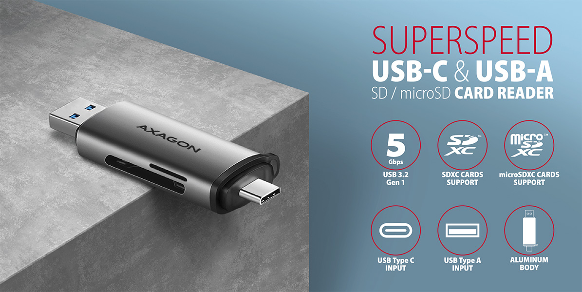 SuperSpeed USB čtečka paměťových karet CRE-SAC, která je určena pro všechny verze SD a microSD karet s kapacitou až 2TB.