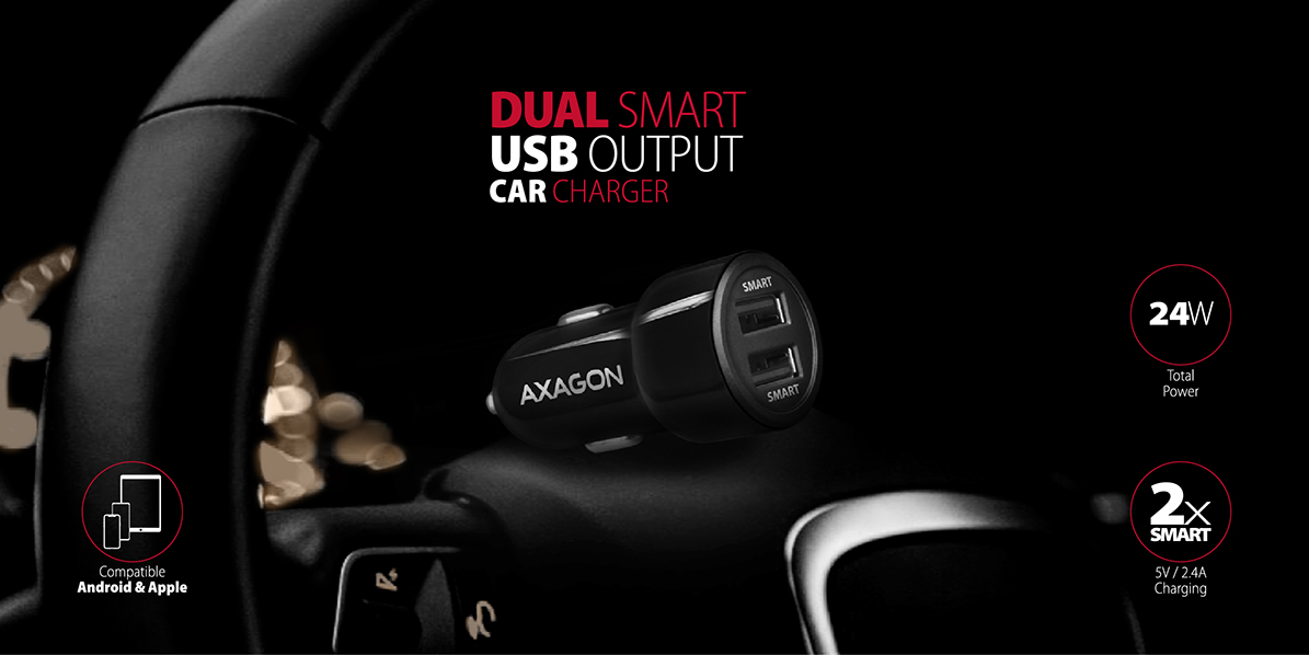 Se dvěma výstupy SMART 5V/2.4 A a celkovému výkonu 24W dobijete své mobilní telefony i tablety stejně rychle, jako síťovým adaptérem.