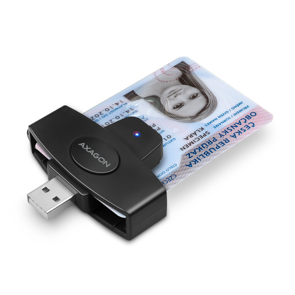 Kompaktní stolní USB čtečka kontaktních Smart karet s dlouhým USB-C kabelem. Vhodná pro aplikaci eObčanka.