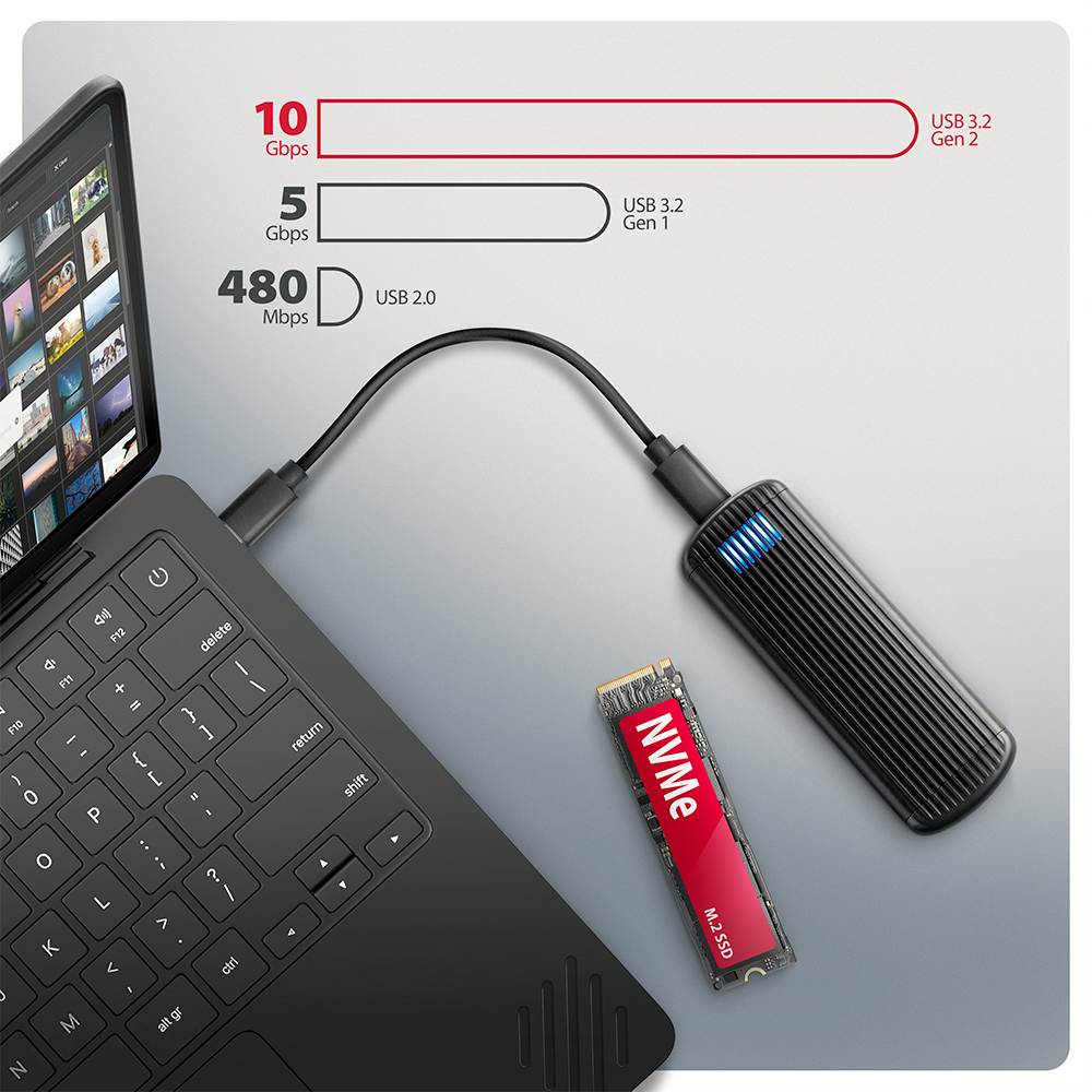 Díky USB 10Gbps rozhraní je přenosová rychlost až 10 Gb/s. Externí M.2 box podporuje moderní funkce např. UASP, TRIM a umožňuje čtení S.M.A.R.T. informací monitorujících stav disku.