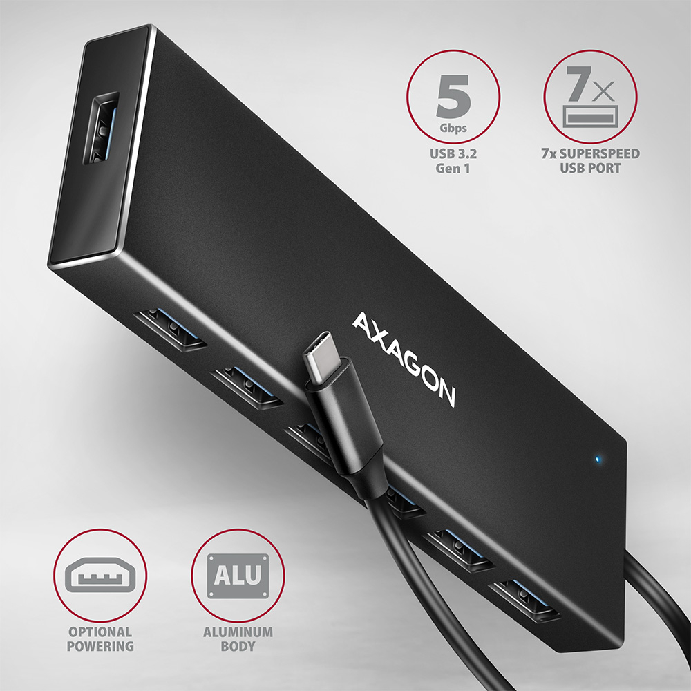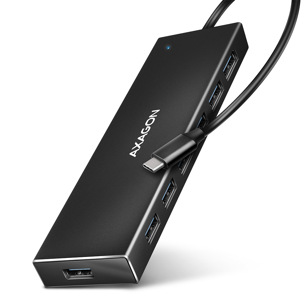 Tenký USB-C 3.2 Gen 1 (USB 3.0) hub AXAGON HUE-F7C s USB kabelem dlouhým 30 cm snadno a rychle připojí k notebooku až sedm USB zařízení současně. Standard USB 3.2 Gen 1 umožní přenosovou rychlost až 5Gb/s.