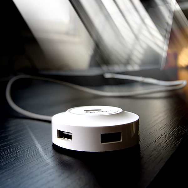 USB porty rozmístěné po obvodu hubu pro bezproblémové připojení jakéhokoliv USB zařízení s velkým objemem hmoty kolem konektoru.