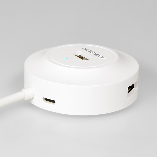 Díky dvěma vstupním USB konektorům (standardní velký USB A-M pro PC a micro USB M pro tablet/smartphone), které jsou součástí napevno uchyceného 80 cm USB kabelu je hub vždy připraven pro jakékoliv využití. Není třeba dalších kabelů nebo redukcí.