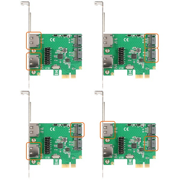 • Možnost výstupu na libovolnou kombinaci dvou externích eSATA konektorů a dvou interních SATA konektorů.