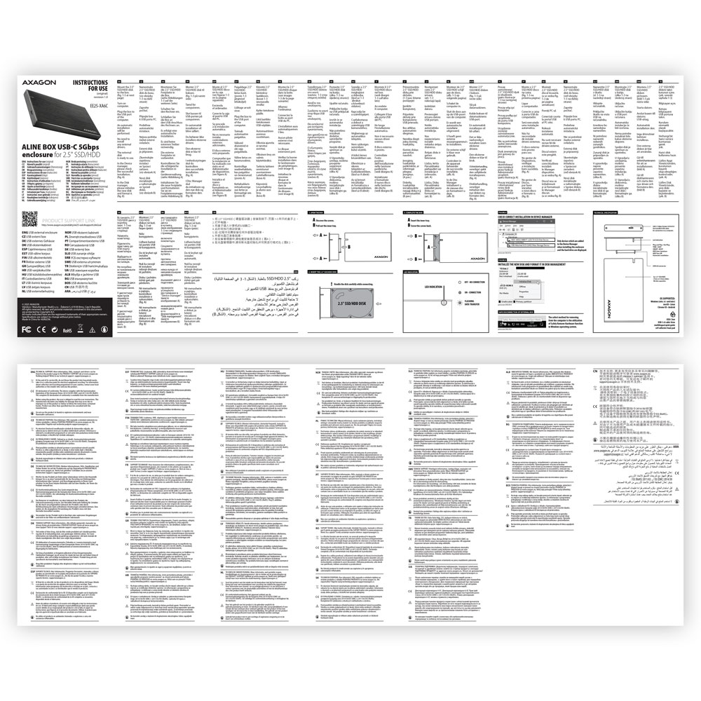 A kompakt alumínium AXAGON EE25-XA6 ALINE box külső tok nagy sebességű USB-C 5Gbps interfésszel 2.5" SATA merevlemezek számára készült vagy SSD. A dobozon található kétoldalas USB-C csatlakozó a mellékelt USB-C -> USB-A kábellel együtt megbízható csatlakozást tesz lehetővé a számítógéphez.