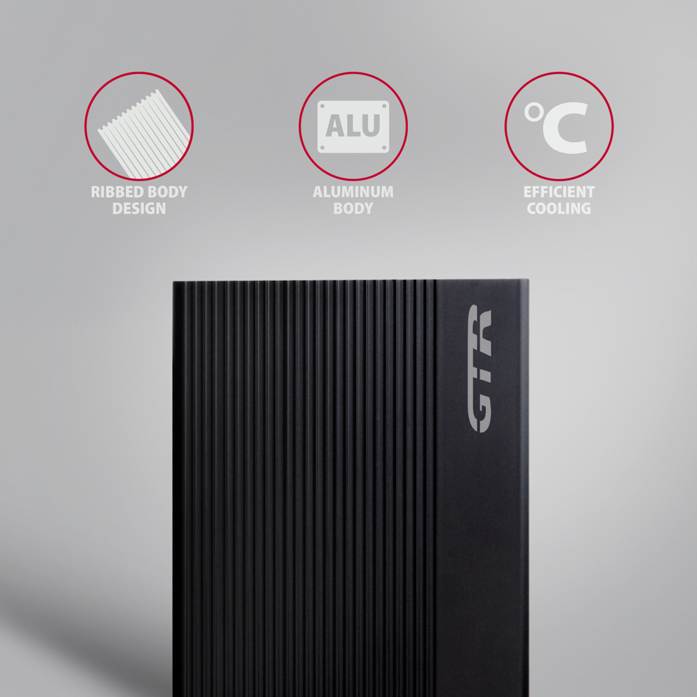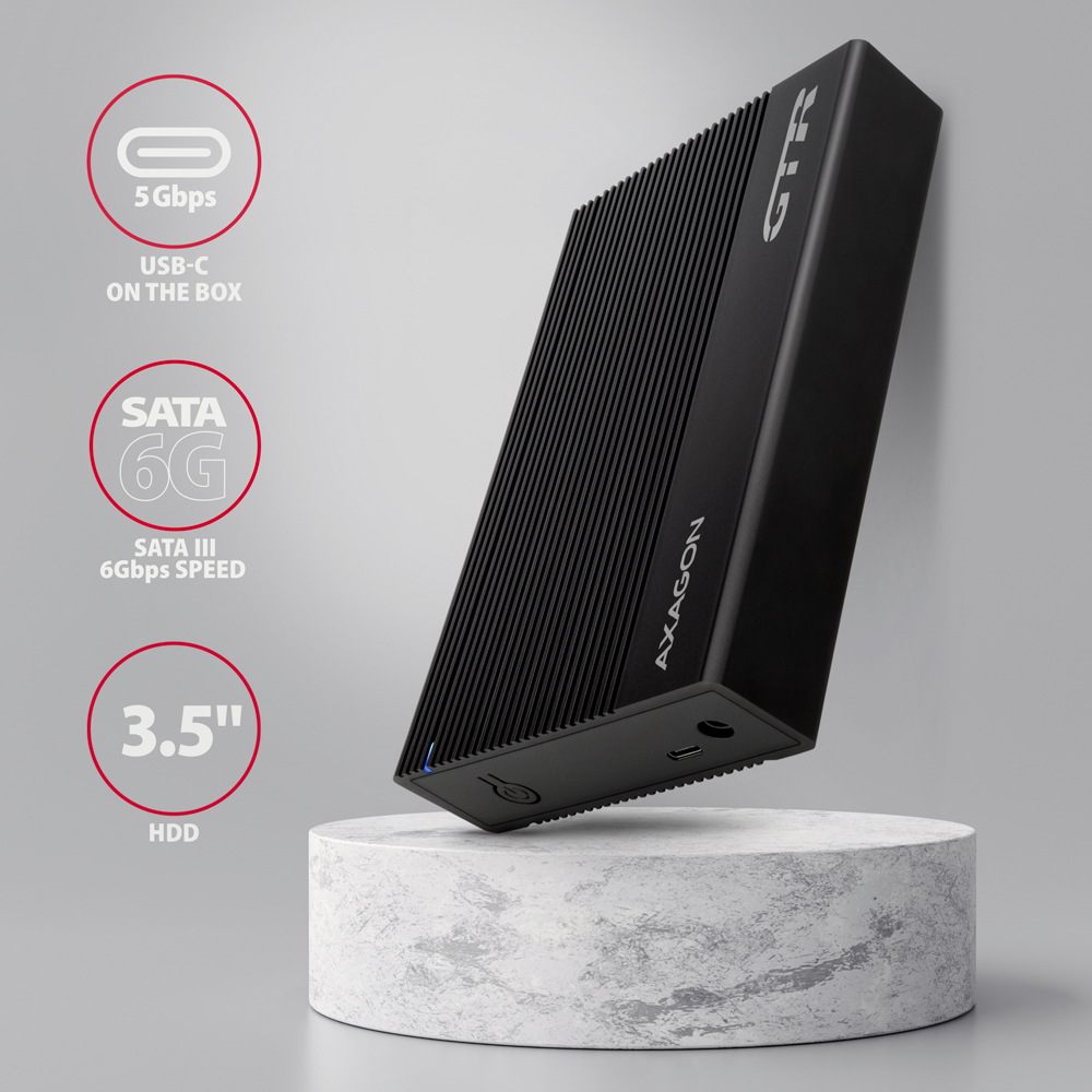 Bordázott alumínium külső AXAGON EE35-GTR RIBBED doboz USB 3.2 Gen 1 (USB 3.0) interfésszel 3.5"-os SATA merevlemezekhez. A dobozon található kétoldalas USB-C csatlakozó a mellékelt USB-C <-> USB-C kábellel és az USB-A -> USB-C adapter együtt megbízható csatlakozást tesz lehetővé a számítógéphez.
