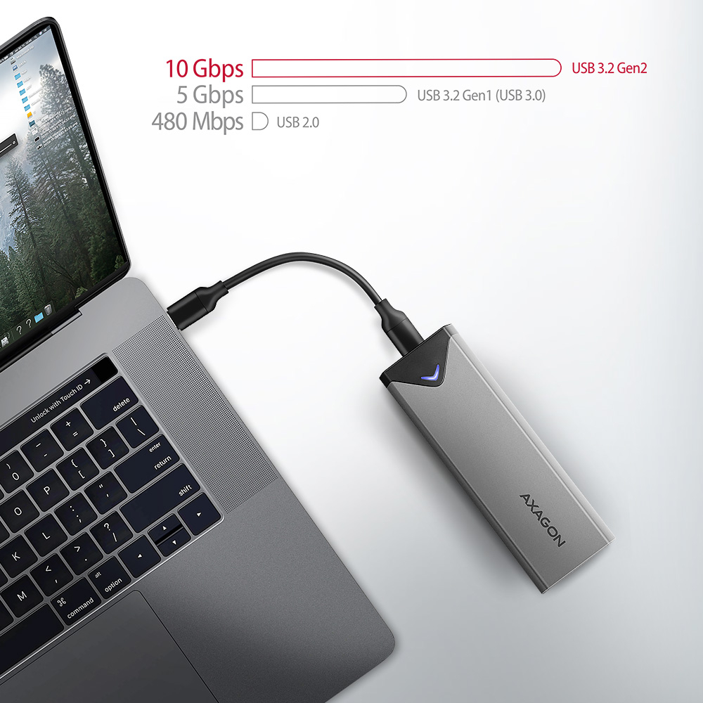 A gyors USB 3.2 Gen 2 csatlakozónak hála az átviteli sebesség akár 10Gb/s is lehet. A külső M.2 doboz más modern funkciókat is támogat, például UASP, TRIM és lehetővé teszi a S.M.A.R.T. információk olvasását a lemez állapotának figyelésével. Készenléti állapot támogatása üresjáratban.