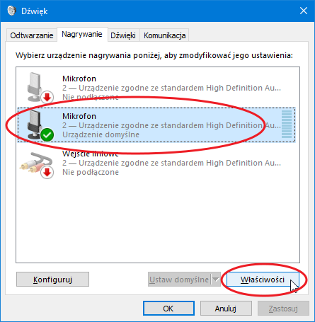 Po czym wybierz z listy "Mikrofon (Urządzenie domyślne)" i kliknij na przycisk "Właściwości".