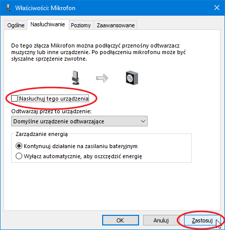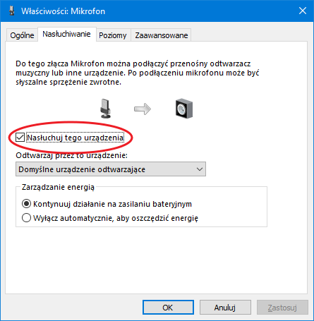 W nowo otwartym oknie wybierz zakładkę "Nasłuchiwanie" i usuń krzyżyk przy możliwości "Nasłuchuj tego urządzenia"