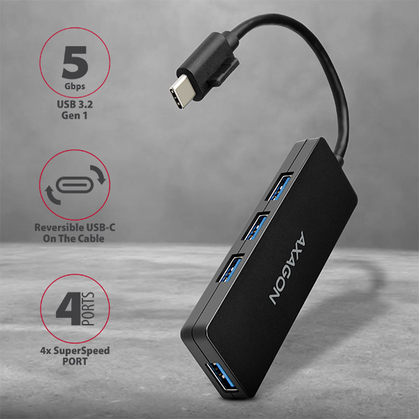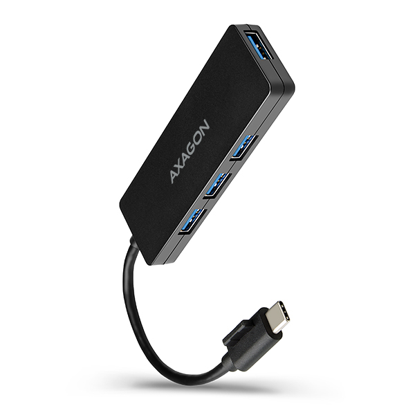 4-portowy hub USB 3.2 Gen 1 AXAGON HUE-G1C jest małym i cienkim hubem nadającym się nie tylko do podróży. Elegancki korpus z tworzywa sztucznego z półmatową, drobnoziarnistą, odporną na odciski palców powierzchnią. Podłącz do czterech urządzeń USB jednocześnie do laptopa lub komputera w prosty i szybki sposób.