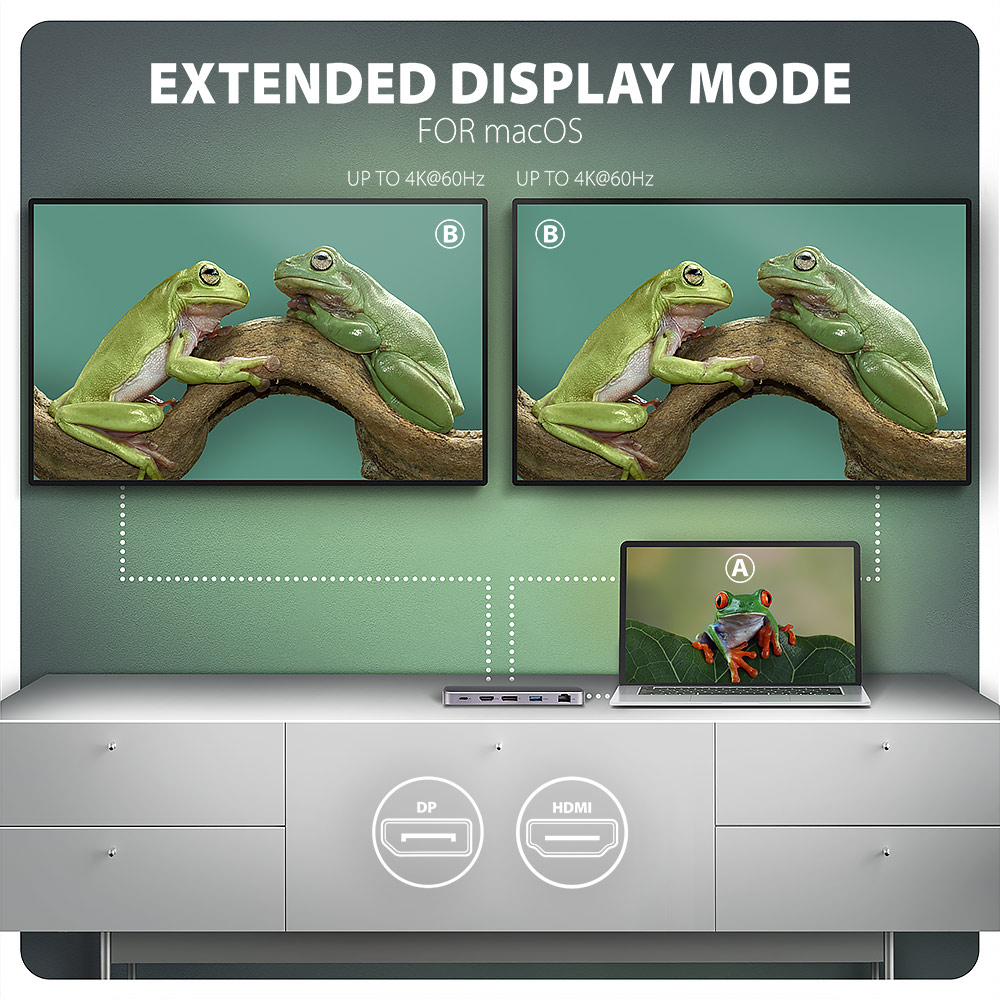 Multiportový USB-C 10Gbps hub AXAGON HMC-12GM2 GEN2COMBO 12in1 rozšíri Váš notebook, počítač alebo telefón o jedenásť portov a externý box pre M.2 disk. Cez obojstranný USB-C konektor ľahko a rýchlo pripojíte k počítaču až dva monitory, štyri USB zariadenia, Gigabitovú ethernet sieť, slúchadlá, čítačku SD kariet a NVMe alebo SATA M.2 SSD disk. Zároveň získate možnosť napájania notebooku pomocou technológie Power Delivery. USB-C hub vám tak poskytne jednoduchú a skladnú dokovaciu stanicu 12v1 k notebooku ako je napríklad Apple MacBook Air alebo Pro.
