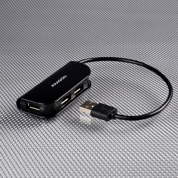 Štvorportový USB 2.0 READY hub AXAGON HUE-X4B s napevno uchyteným USB káblom.